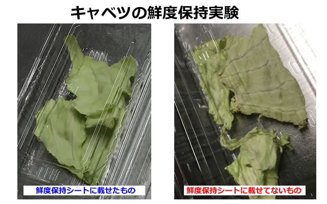 プラスチック容器にキャベツを入れて常温で10日間放置した比較実験。鮮度保持シートの上に載せたキャベツは水分が残りシャキシャキの状態だったのに比べて通常の状態で放置したキャベツは水分が抜けてペシャンコになっていた。