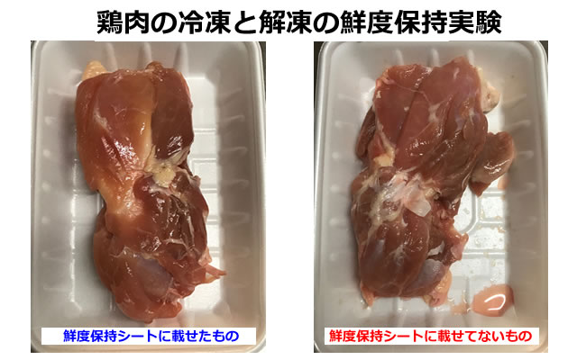 発砲トレーの容器に鶏モモ肉を入れて冷凍庫で凍結させてから解凍した比較実験。鮮度保持シートで包んだ鶏モモ肉は、綺麗な色で肉が締まっていて解凍時にドリップが全く出ていなかった。それに対して通常の状態で凍結し解凍した鶏モモ肉は色が少し色が悪くなり細胞壁が壊れてしまったためドリップが出てしまい肉がダラリと緩んでしまっていた。鮮度保持シートに載せた食材は、凍りながら水分子が3nmまで小さくなるので、凍った水分子が尖らず細胞壁を壊さないで高鮮度で凍結できることで解凍時にもドリップが出にくいです。