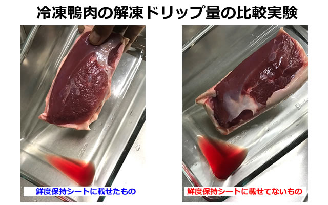 既に冷凍された鴨肉を購入し、ガラス容器に置いて、ガラス容器ごと鮮度保持シートの上で解凍した比較実験。鮮度保持シートの上で解凍した冷凍鴨肉は、ドリップの量が少なかったが、通常の状態で解凍した冷凍鴨肉は大量のドリップが出てしまった。