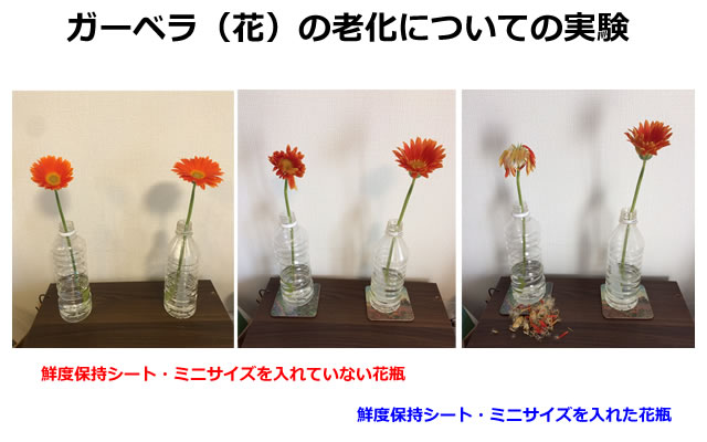 観賞用の花の比較実験です。鮮度保持シートのミニサイズ(今回はミニサイズとして提供中)を花瓶に入れておいた花と通常の状態の花の経過を比較した結果、鮮度保持シートのミニサイズを入れた花は通常よりも長い時間、咲いた。総合的に判断すると、鮮度保持シートの影響のある花瓶の花は、1.咲くのが少し早くなる。2.より多くの水を給水する。3.花の香りが強くなる。4.花の老化が少ない。ということが期待できます。※花の種類により効果が異なります。