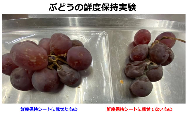 冷蔵庫でも傷みやすいというレッドグローブ種のブドウを常温25度で15日間放置したもの。鮮度保持シートの上に載せたブドウは鮮度が保持できている状態だったのに比べて、通常の状態で放置したブドウは鮮度が落ちて萎んでしまっていた。
