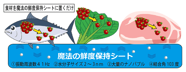 水分子が3nmで77Hzの分子運動となって、流体速度が速く、浸透性が強くて、活発に振動する活きた水となることで同時に食材の鮮度を維持することができるのです。