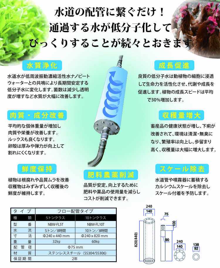 • 水分子の最小化:物理的振動の原理により水分子を瞬時に最小化でき人体、動植物の吸収と代謝を促進します。