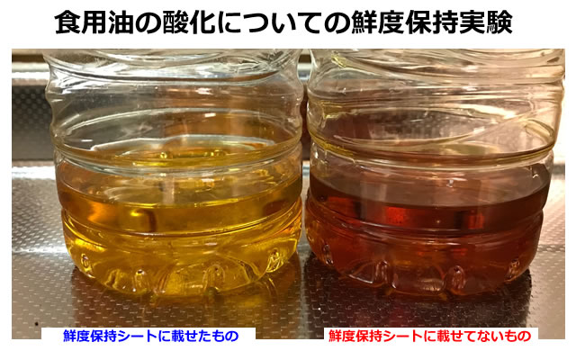 食用の調理油を、150度まで加熱して冷ますを複数回、繰り返して油の酸化度合を比較実験した結果。食用調理油のプラスチックボトルに鮮度保持シートを巻き付け一晩置いた油は、油の温度上昇が早く上がり、冷めるのも遅くなり、発煙点も高くなることが分かった。また非常に酸化しにくくなり、通常の油の状態に比べて長持ちしていた。