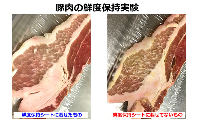 プラスチック容器に豚肉の切り身を入れてラップに包み冷蔵庫で11日間放置した比較実験。鮮度保持シートの上に載せた豚肉はまだまだ綺麗な色で臭いも少なく鮮度が保持できている状態だったのに比べて、通常の状態で放置した豚肉は変色して黄色いネバネバが出てきていて腐敗臭があった。